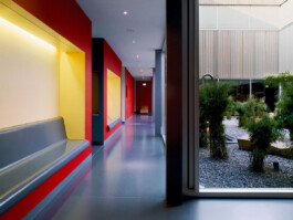 Aus ökonomischen und ökologischen Überlegungen wurden möglichst viele konstruktive Teile der Anlage erhalten und lediglich selektiv Erweiterungen ausgeführt. So bleiben die drei gestaffelten Baukörper (Mehrzweckhalle, Tennishalle und Restaurationstrakt) bestehen. Ein neuer interner Erschliessungsweg wurde so angelegt, dass er die Übersichtlichkeit und Auffindbarkelt stärkt und die bestehenden Nutzungseinheiten sinnvoll anbindet. Die verschiedenartigen Nutzungsbereiche werden über ein einheitliches Material- und Farbkonzept zusammengebunden. Dabei erhalten die Räume ihren Ausdruck und Charakter weniger durch die Materialisierung als vielmehr über die letzte Schicht der Farbe. Zusammen mit dem Künstler Beat Zoderer wurde ein Farbkonzept über die gesamte Anlage erarbeitet. Der Fitnessbereich wurde in die ehemalige Tennishalle eingepasst. Ein eingeschnittener, durchgehender Innenhof zoniert die neue Anlage. Im Erdgeschoss bringen obenliegende Fensterbänder zusätzlich Licht ins Innere. Im Untergeschoss dient der Hof als uneinsehbarer Aussenraum für die Sauna und stellt einen Bezug zum Tageslicht her.