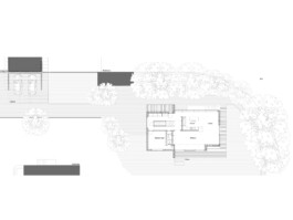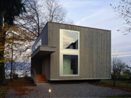 Die Lage auf einer kleinen Landzunge im Zürichsee prägte den Entwurf des Einfamilienhauses wesentlich. Eine Betonwanne verankert es ähnlich einem Schiffsrumpf an Land. Der Aufbau, als vorgefertigter Holzbau erstellt, entwickelt sich gemäss den landschaftlichen Bedingungen. Die Räume und deren Fenster richten sich präzise auf die diversen Bezüge aus. Das öffentlichere Erdgeschoss sowie das privatere Obergeschoss sind über die Diagonale entworfen und über eine grosszügige Halle miteinander räumlich verbunden. Im Obergeschoss sind die Sanitärbereiche schaltbar, dh. sie sind intern sowie von aussen erschlossen und profitieren ebenfalls von der Seesicht.